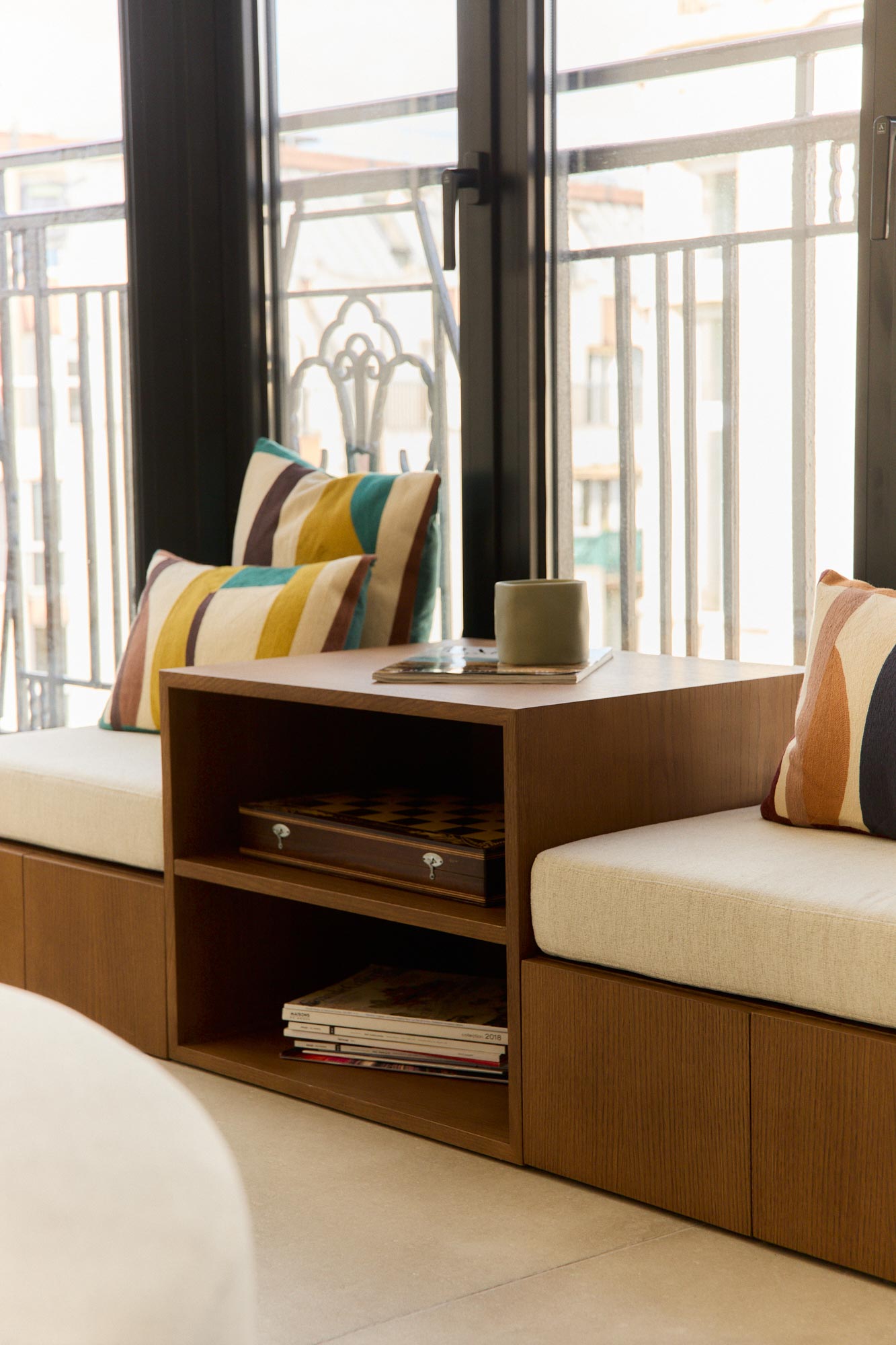 En empruntant l’escalier à l’entrée de l’appartement, on accède au second niveau, entièrement dédié au salon et à un espace bureau. Encore une fois, l’architecture atypique du lieu a nécessité sur-mesure et créativité : un canapé courbe a été conçu pour offrir une assise généreuse malgré la configuration exigeante. Sous les fenêtres, un meuble TV sur mesure accueille également deux assises supplémentaires pour recevoir confortablement.