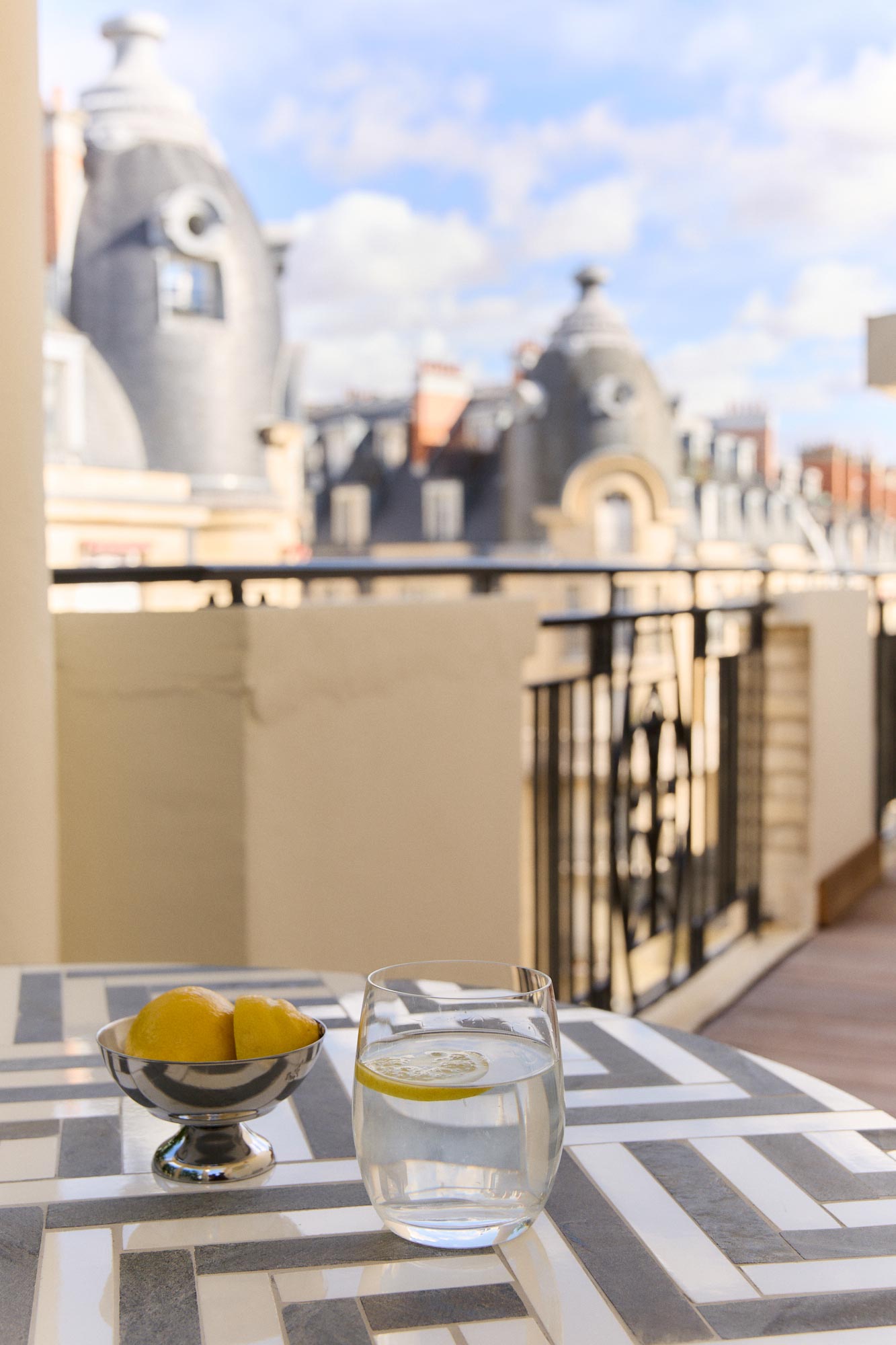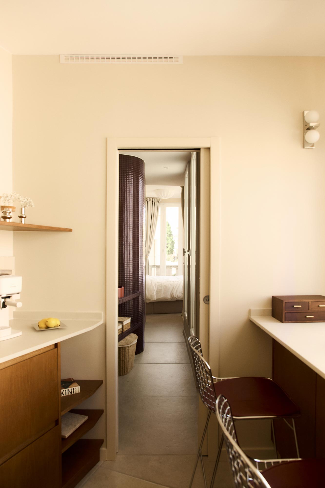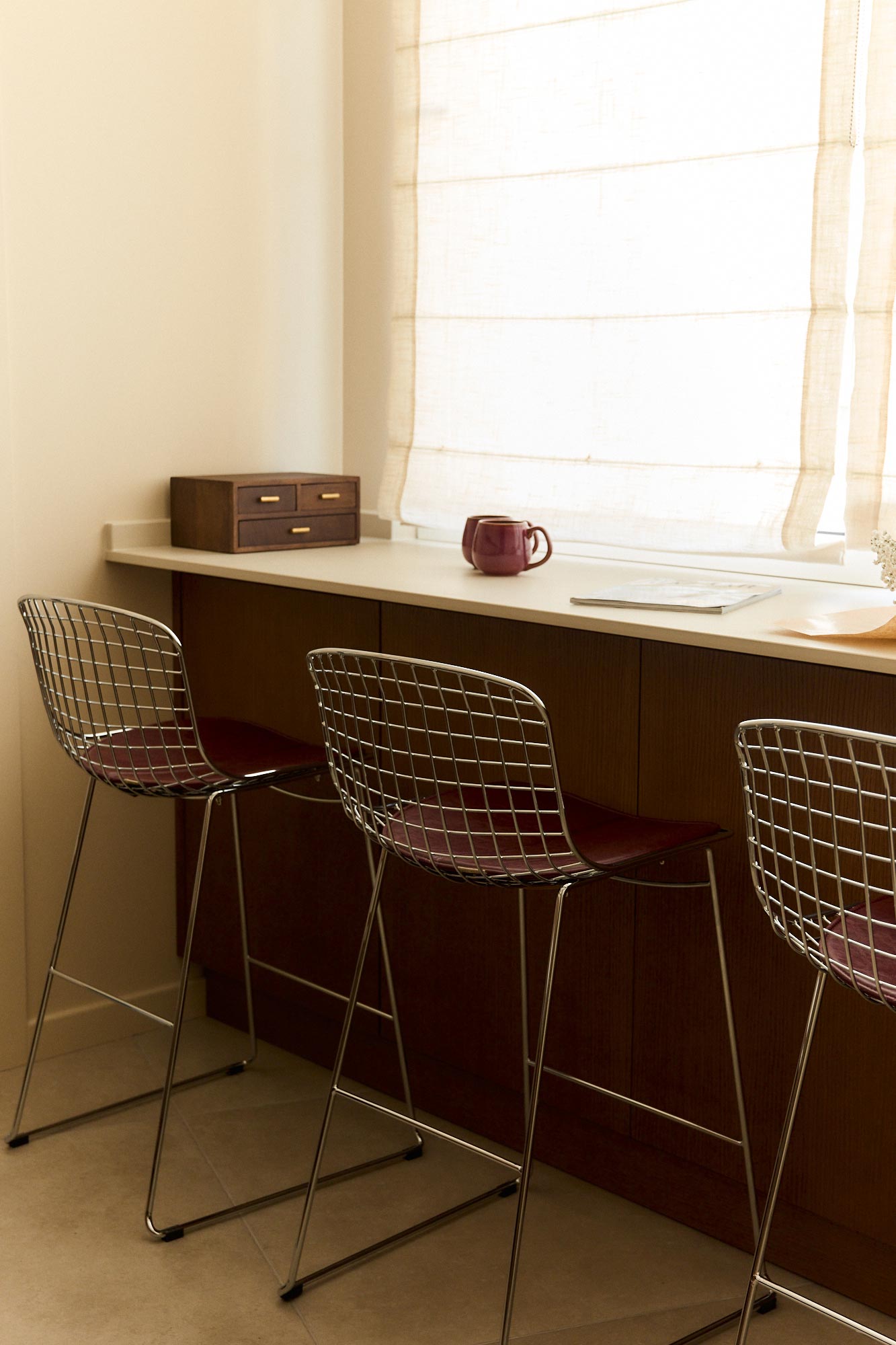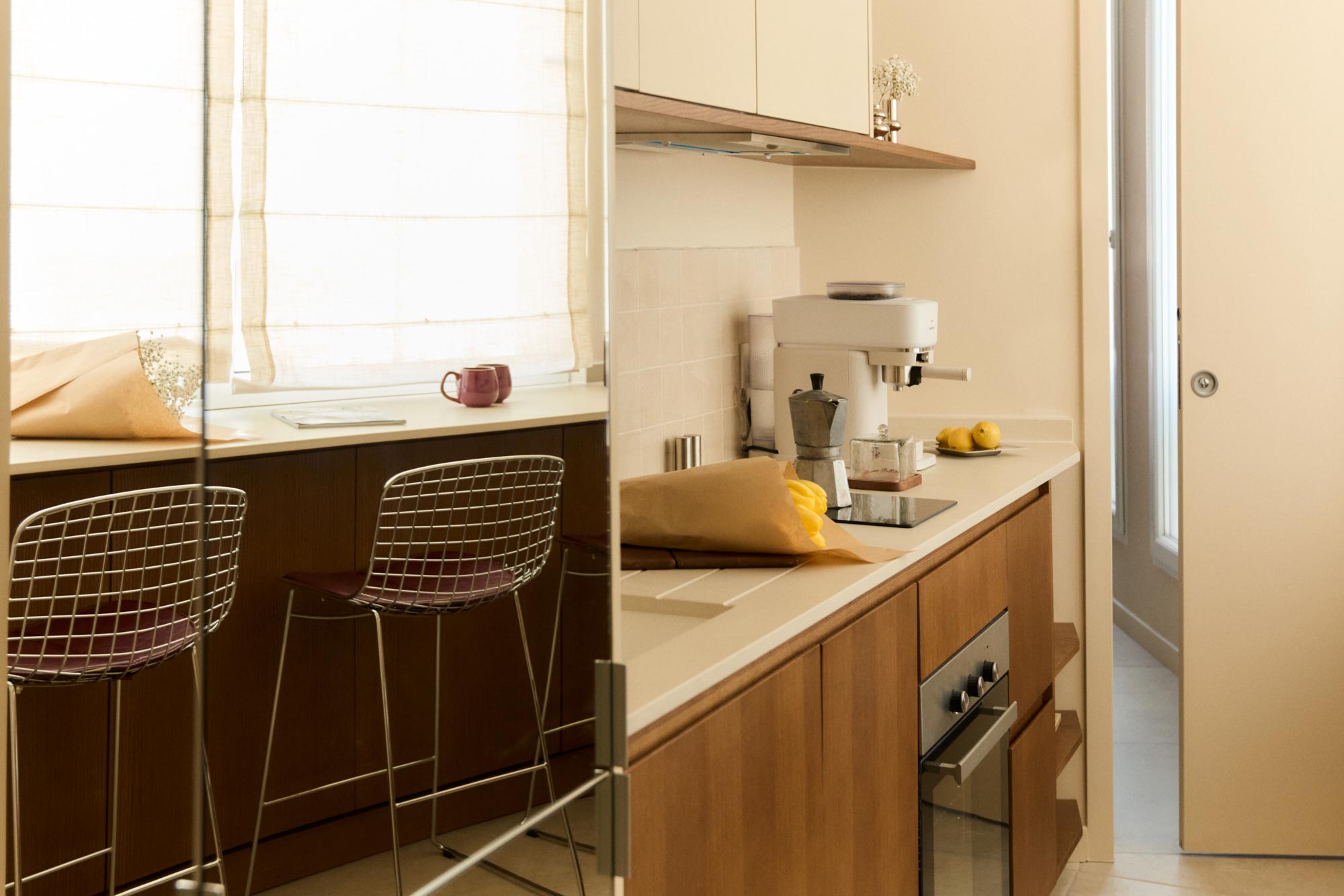 Là où se trouvait auparavant une zone un peu flottante, un espace hybride entre salle à manger et bar, une véritable cuisine ouverte a pris place : fonctionnelle, élégante et parfaitement équipée. Sous les fenêtres hautes, un mange-debout a été installé, permettant de déjeuner tout en admirant les toits de Paris – un petit plaisir quotidien.
