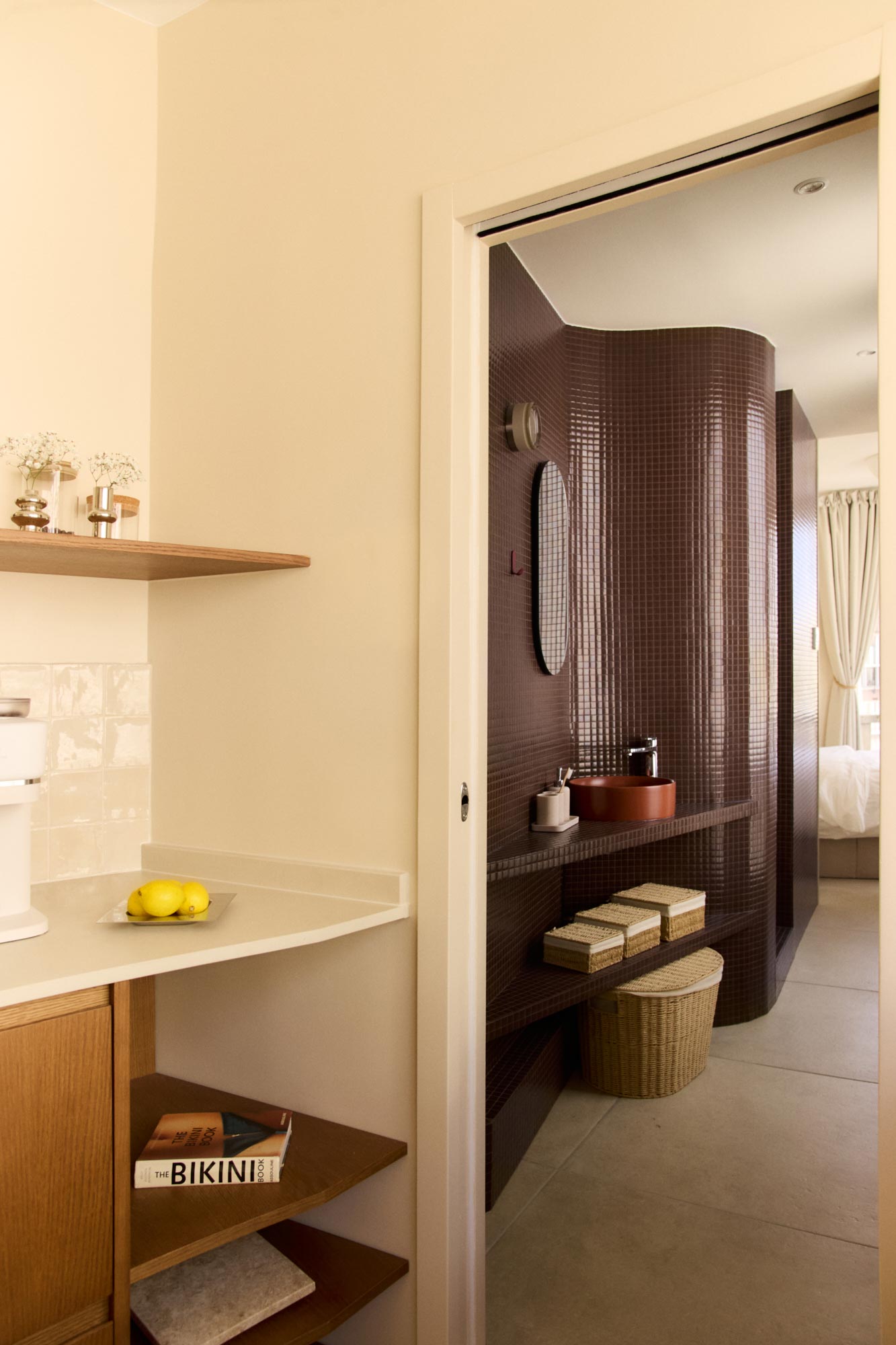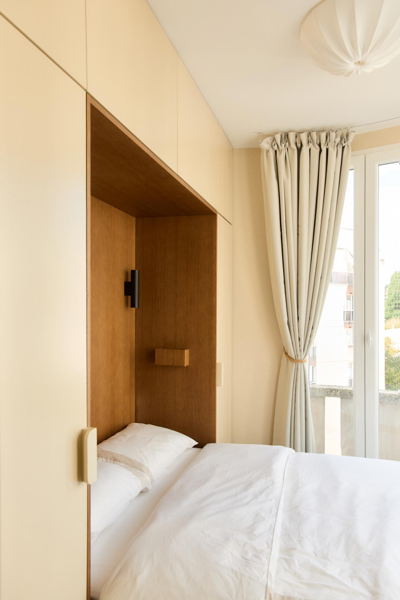La découverte se poursuit avec la nouvelle salle d’eau, dont les courbes généreuses viennent adoucir l’effet “entonnoir” du plan d’origine menant au coin nuit. Ce dernier a été optimisé au maximum : création d’un pont de lit pour ajouter du rangement, intégration d’une tringle encastrée, et mise en valeur d’un espace type bow-window surplombant l’avenue Mozart.